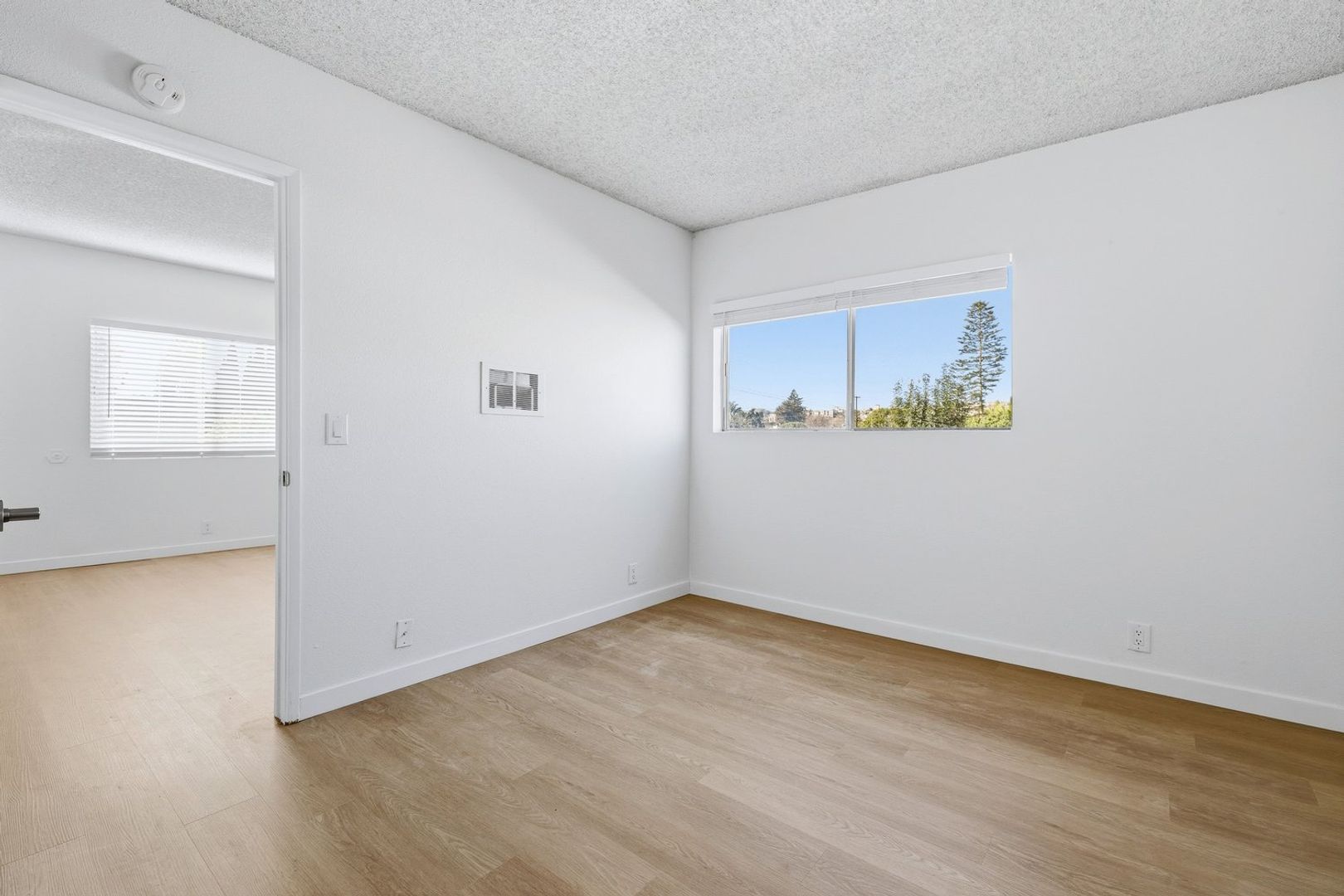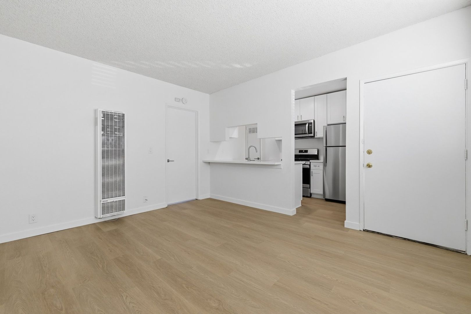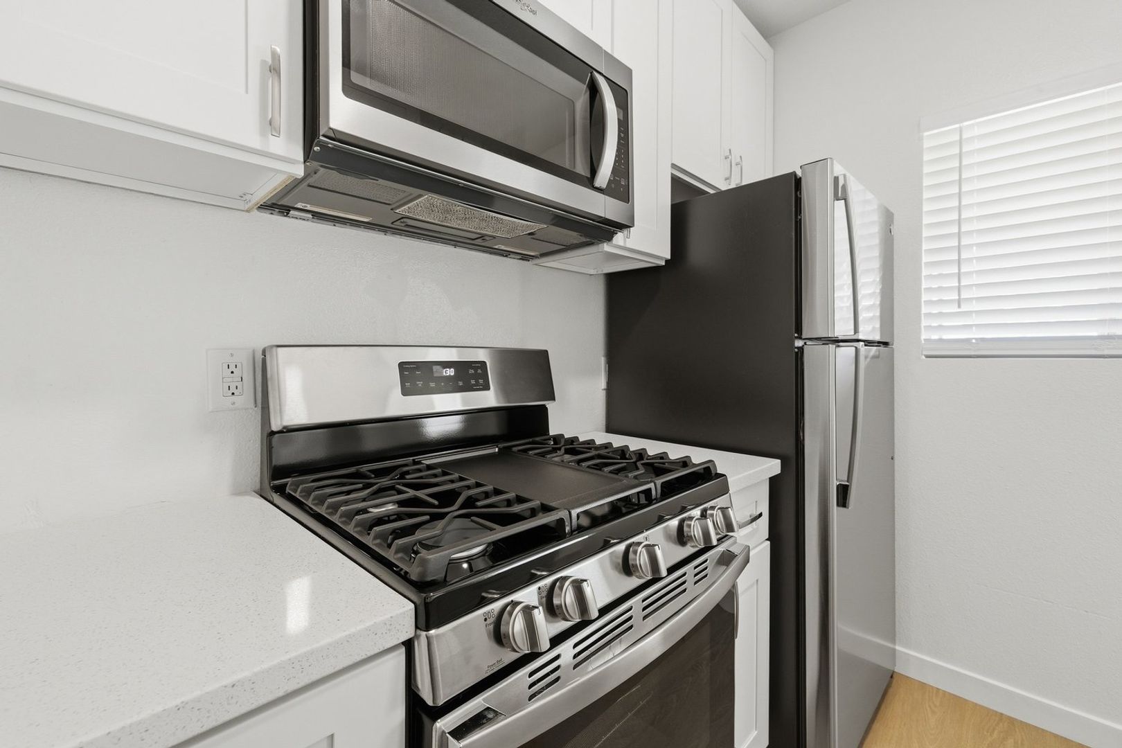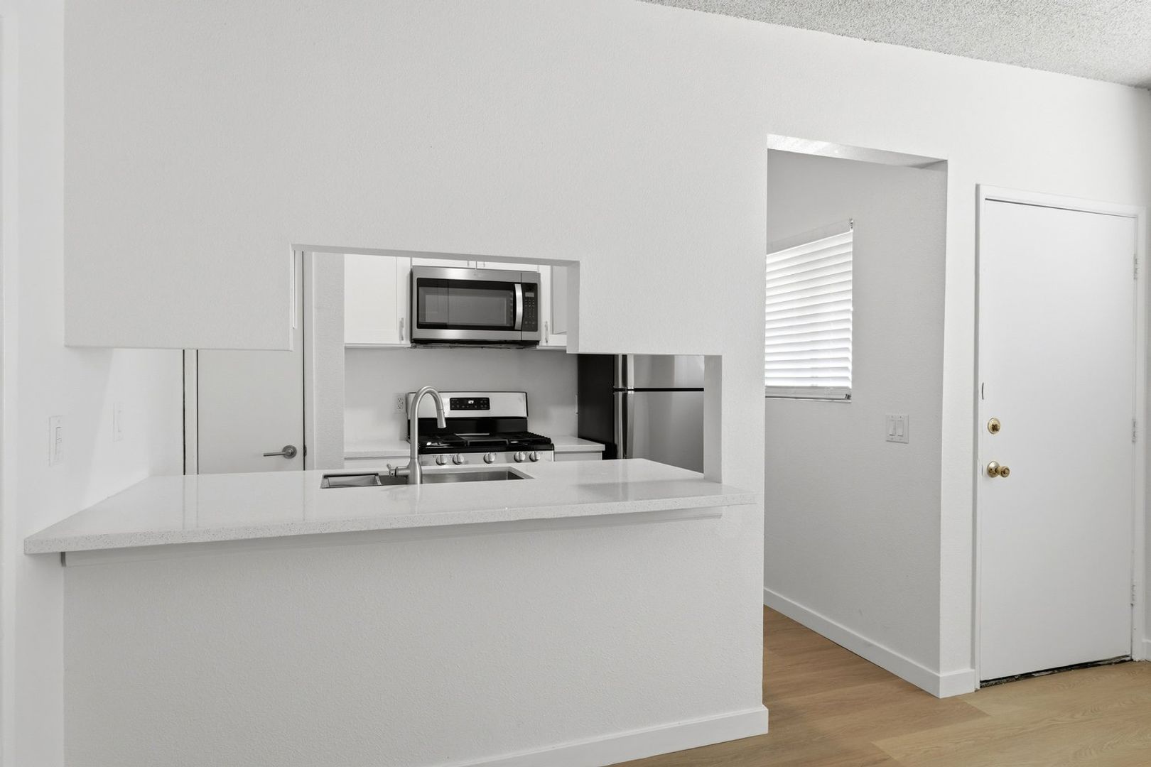 Discover this well-appointed 1-bedroom, 1-bath upstairs apartment in Ventura, CA. The unit features an open living area and a spacious bedroom, along with durable vinyl flooring, solid wood cabinetry, quartz countertops, and stainless steel appliances, including a microwave, gas stove, and garbage disposal. The bathroom includes a convenient shower-tub combination, and the unit is equipped with a heater and window coverings for added comfort.