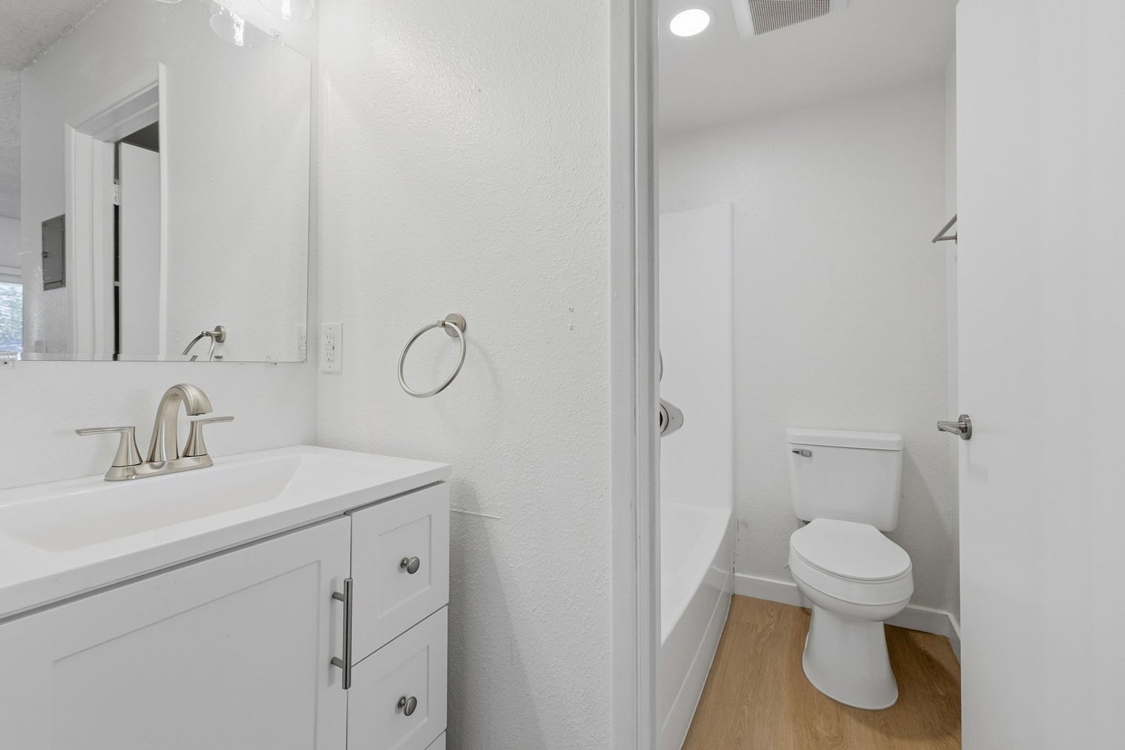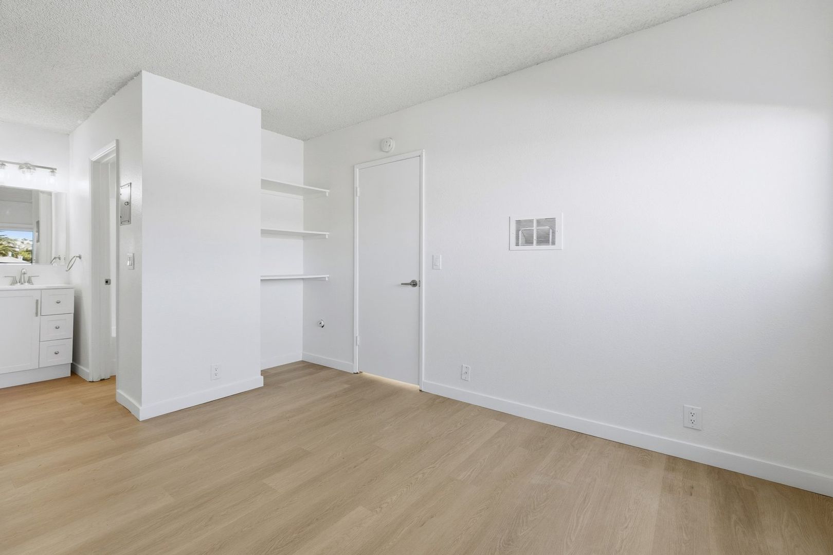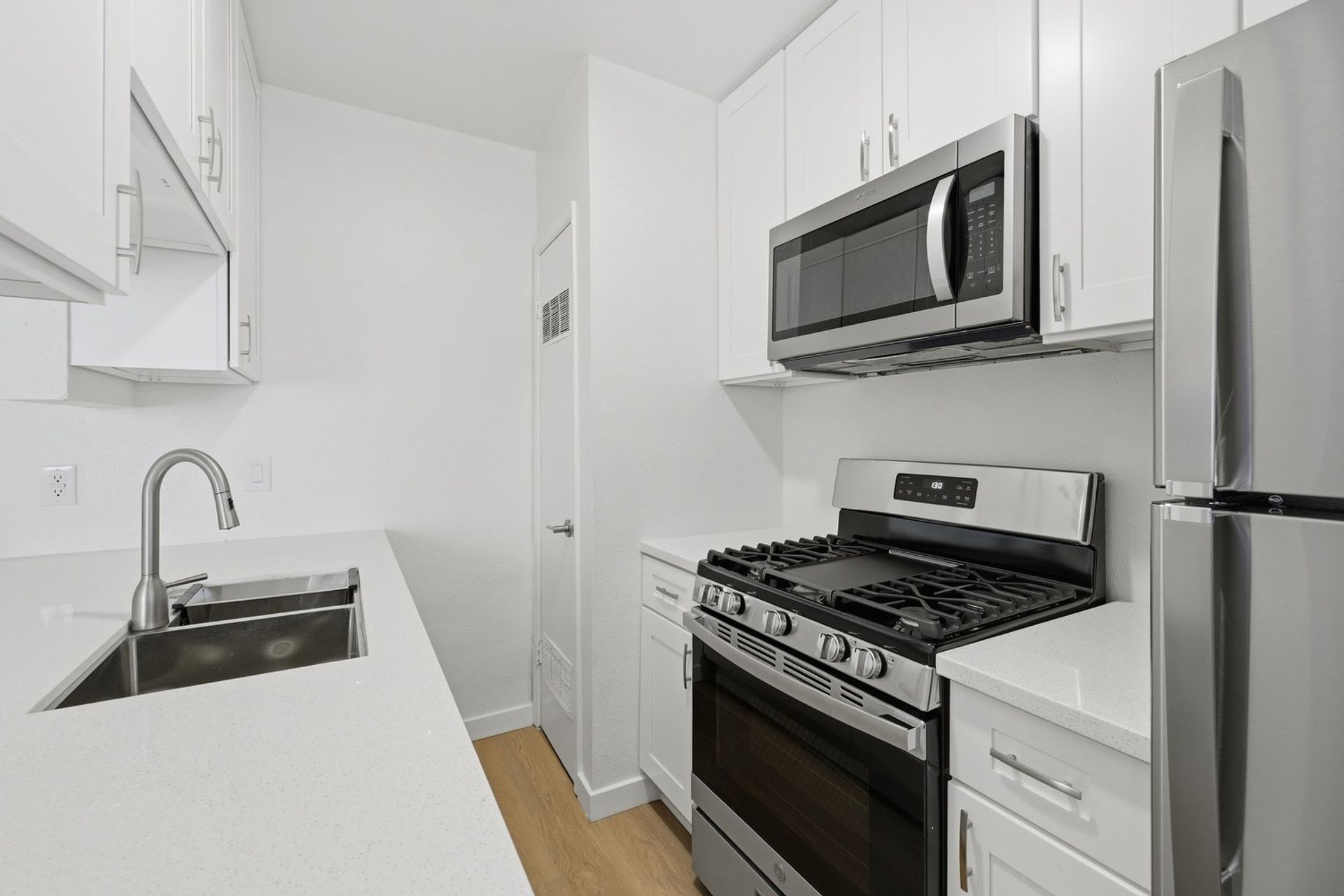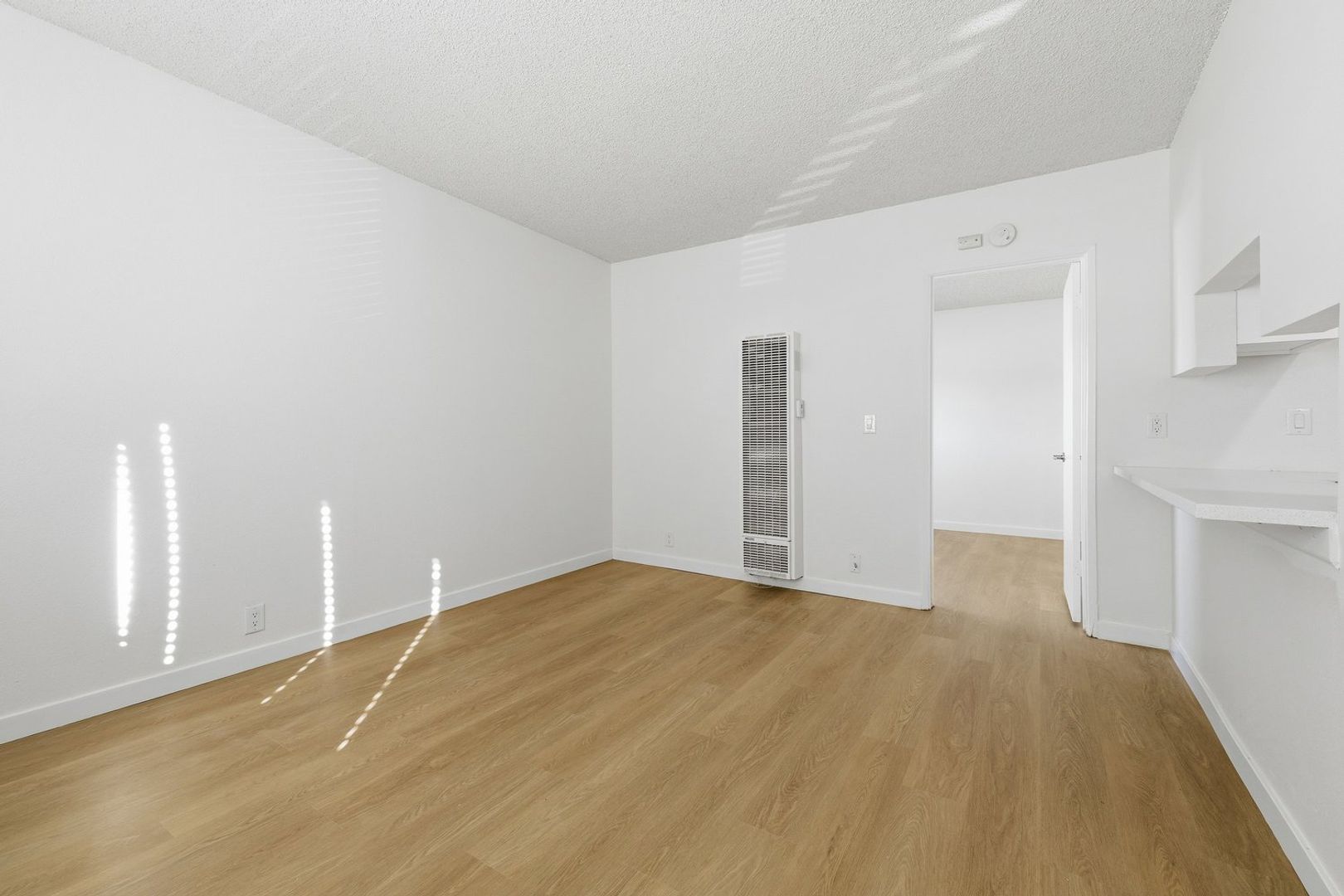 Discover this well-appointed 1-bedroom, 1-bath upstairs apartment in Ventura, CA. The unit features an open living area and a spacious bedroom, along with durable vinyl flooring, solid wood cabinetry, quartz countertops, and stainless steel appliances, including a microwave, gas stove, and garbage disposal. The bathroom includes a convenient shower-tub combination, and the unit is equipped with a heater and window coverings for added comfort.