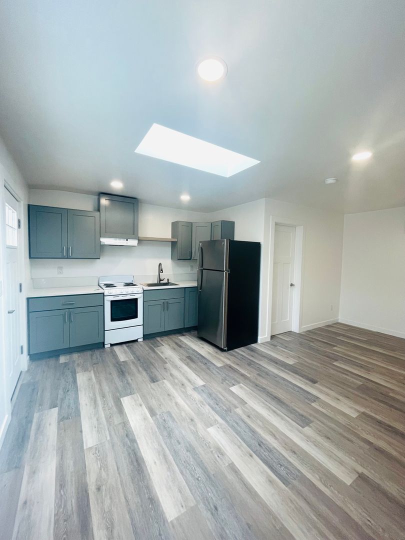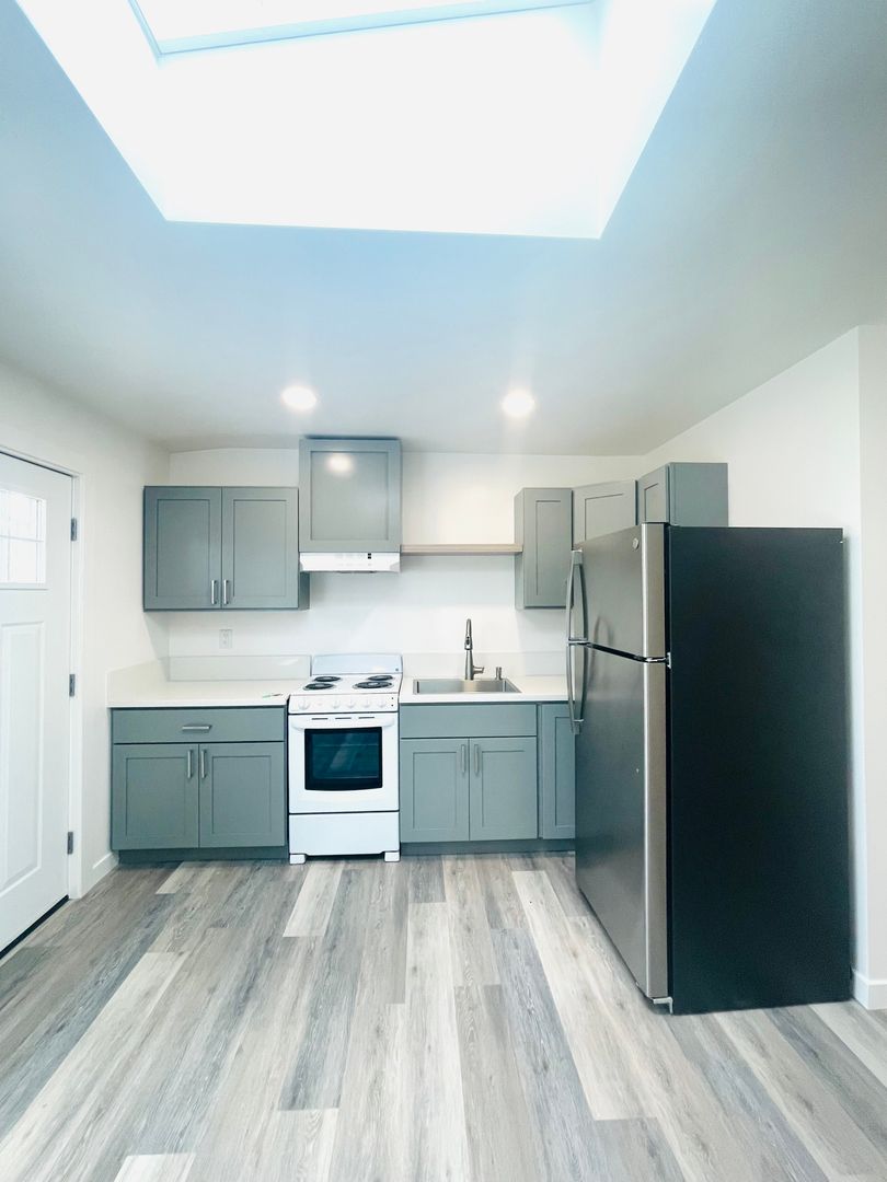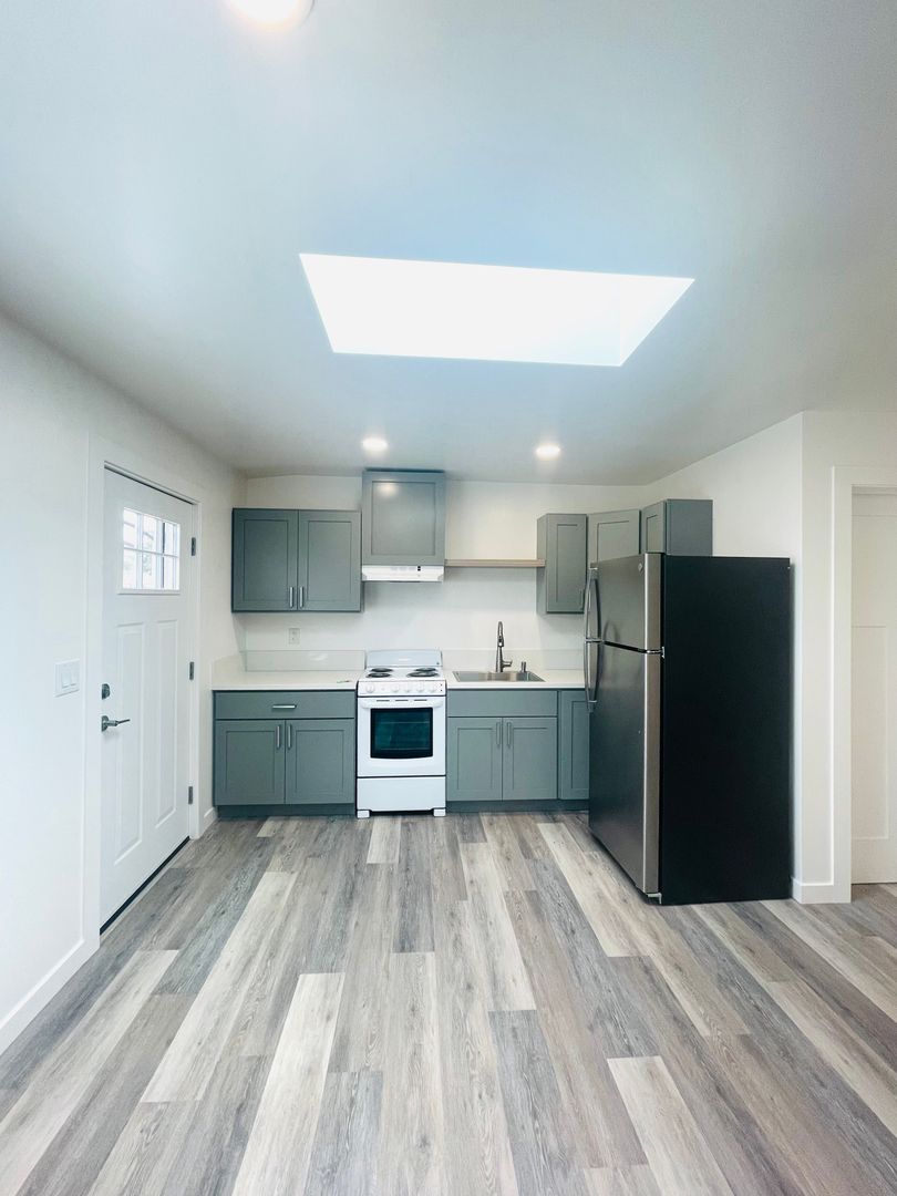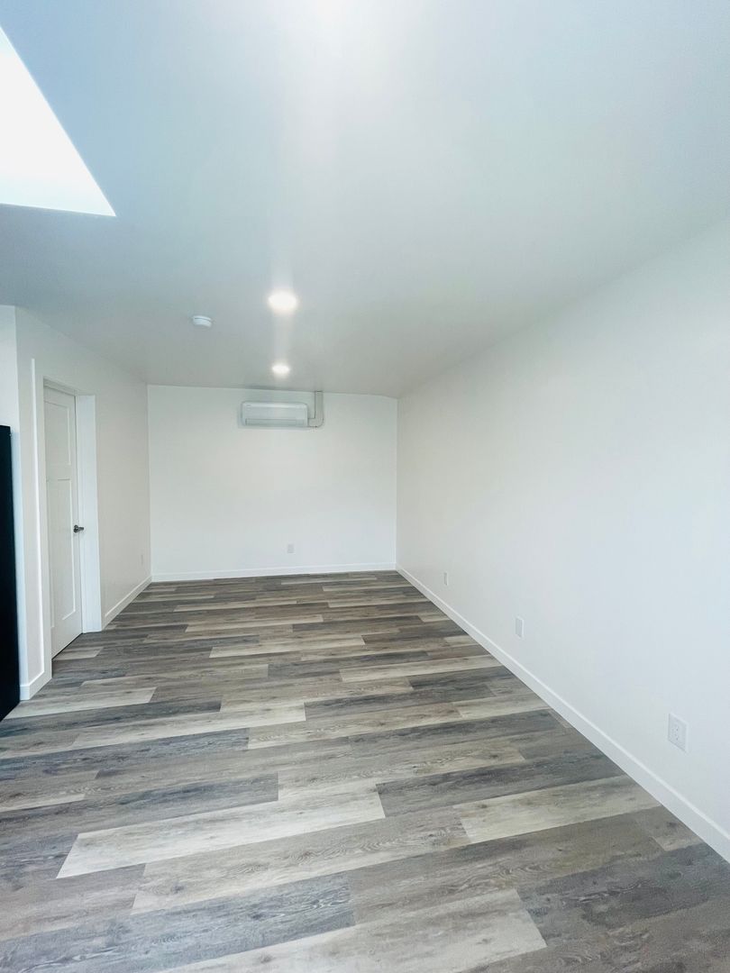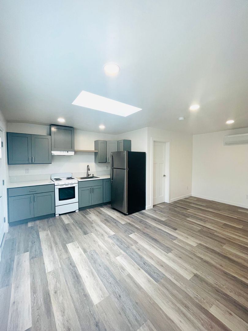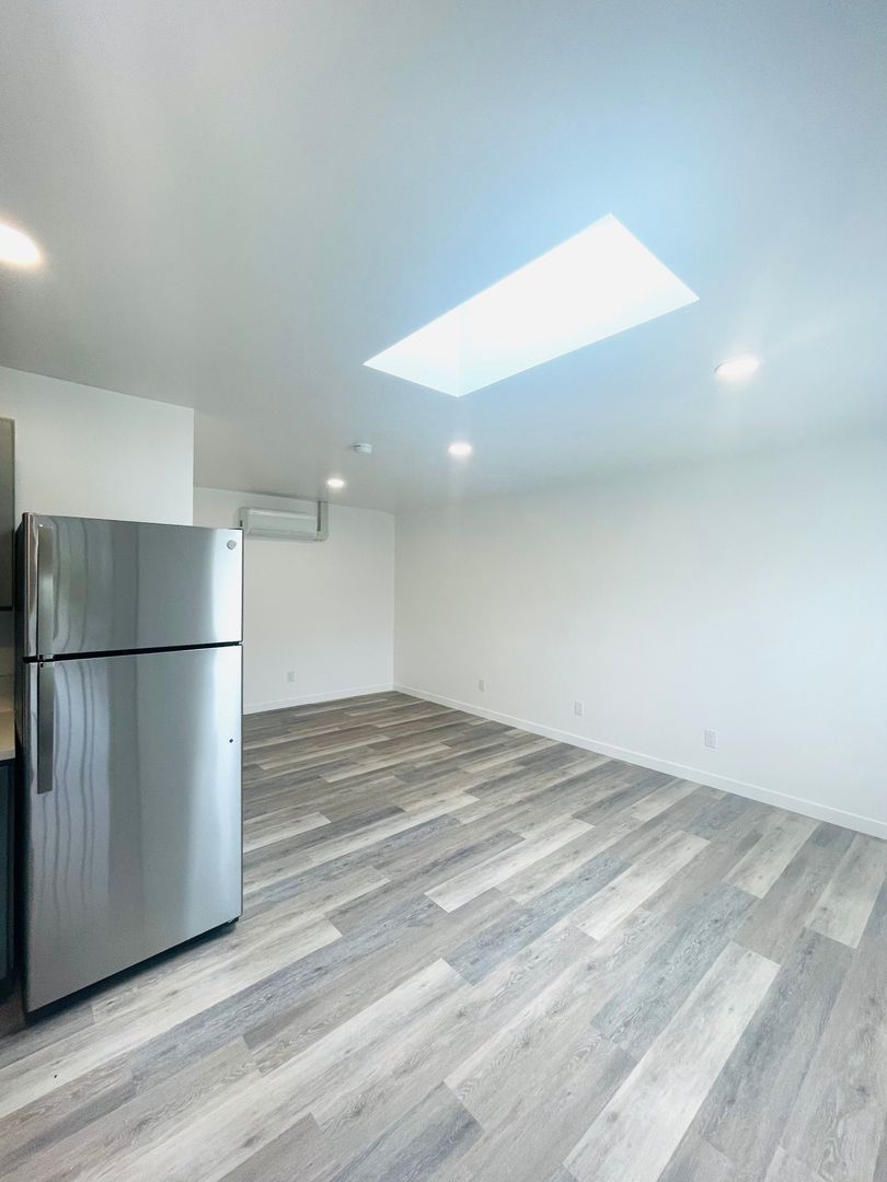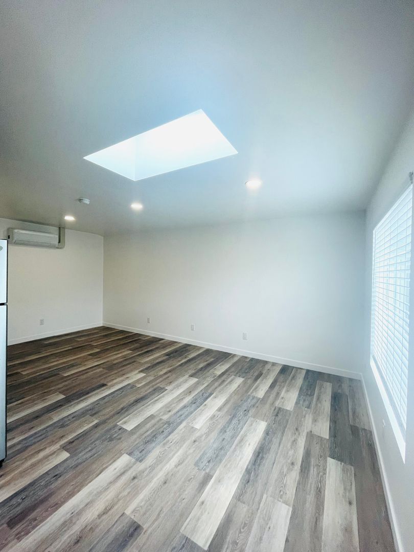 Discover a well-appointed studio apartment in Ventura, CA, featuring an efficient layout with a full bathroom and modern finishes. The space includes vinyl flooring, quartz countertops, a stainless sink and stainless steel appliances with an electric stove. Natural light enters through a skylight and energy-efficient windows, complemented by recessed lighting and window coverings. Comfort is supported by air conditioning and a heater. Additional practical features include a storage area, a security gate, and street parking. This apartment offers a contemporary, functional setting in a convenient Ventura location.